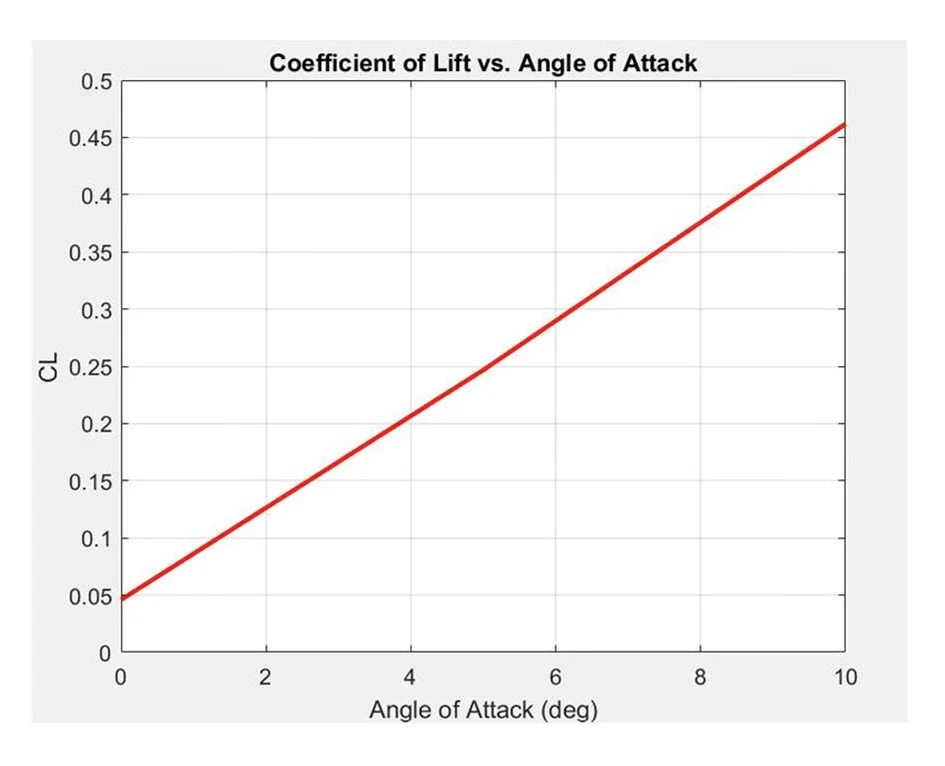 • Displayed an approximately linear relationship from 0° to 10°, with a peak lift coefficient of 0.46