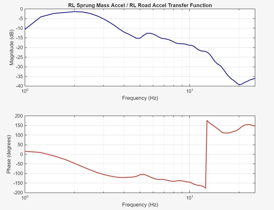 • Verified that CG-level transfer functions exhibited the same resonant trends with reduced magnitudes to demonstrate how the suspension effectively filters vibration